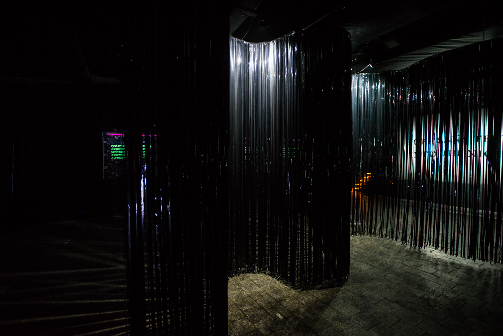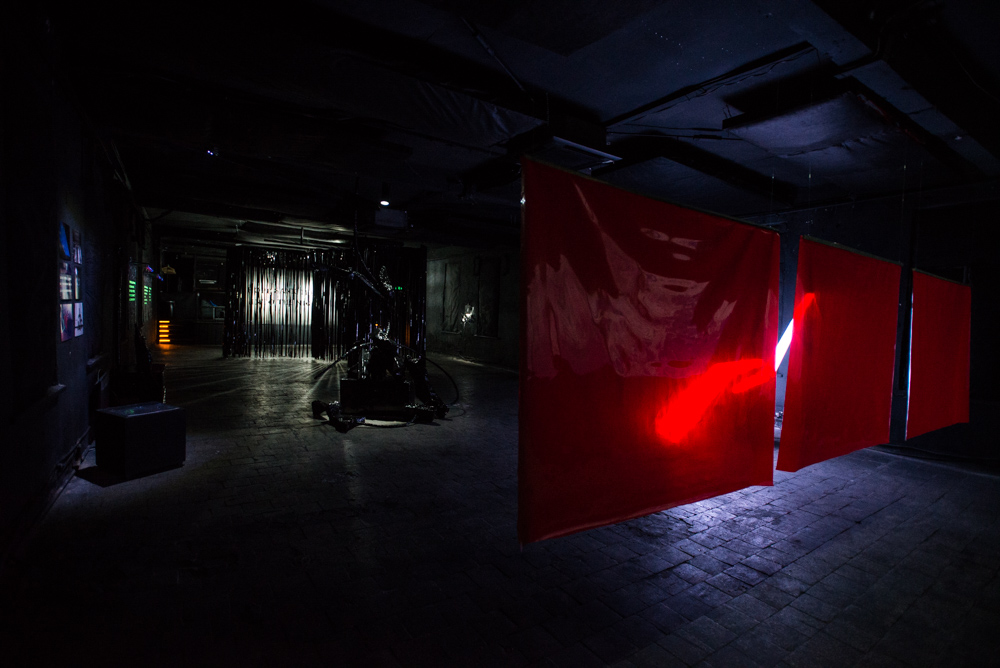 The first solo show in Ukraine of Apparatus 22, HOPE SANK TEETH INTO THE NIGHT, is drawing on a odd viewpoint: understanding the day(time) as extension of the night(time); An afterthought of the afterdark. The exhibition is shaped as a direct, yet surprising answer to the very unique setting of the Closer Art Center. Associated with Closer – an iconic club of contemporary Kiyv set within a post-industrial complex, the exhibition space was, until recently, used for raves: it features hermetically closed interiors repurposed from typical “club” architecture. In troubled places – Kiyv included – clubbing proves to be a fierce escape from everyday routine. It can very well turn into a political gesture too. A survival strategy no doubt. First time shown in such a peculiar context, several new works and site specific versions of recent installations by Apparatus 22 are bringing to the fore the topic of resistance in the face of a tedious status quo. The collective is very much interested in clubbing as a social and political phenomenon, underlining its counter cultural narrative. Despite its commodification by the cultural mainstream, clubbing still provides a space in which to share common feelings and emotions as one of the most powerful tools for empowering a community.